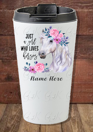 Take your beverage on the road with these Just A Girl Who Loves Horses Latte Tumblers. They are the perfect companion for all your outdoor adventures. This stainless steel 16oz tumbler has double wall stainless steel vacuum insulation that will keep your beverage hot or cold. Each tumbler includes a lid that closes securely to keep your beverages from spilling out.
