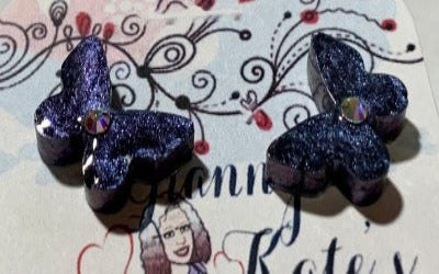 Butterfly Stud Earrings to dress up your day or night. The two pairs showing is filled with Purple/Green/Blue chameleon mica powder at different angles of light. Then I adorned each earring with a one crystal gems to add a touch of posh. Comes in pierced only.