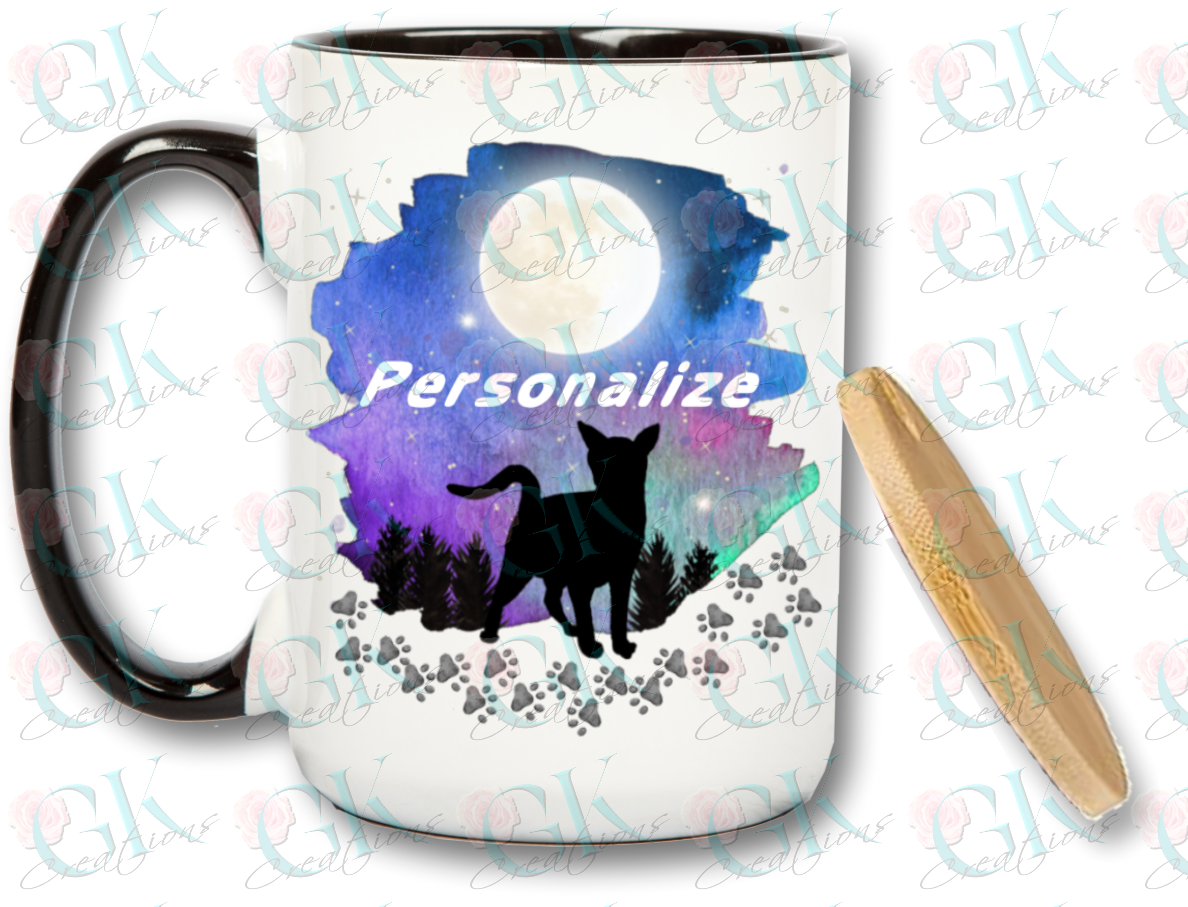 Cat silhouette in front of moon with kitty paws coffee mug.