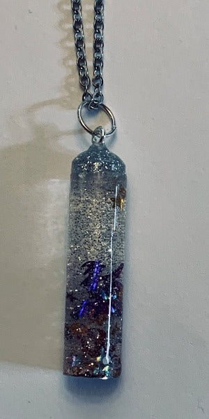 This resin pendant dazzles like crystal with enough silver glitter that is sure to grab attention. Suspended half way down are stars and witches flying about. Item can be made with gold glitter and findings.