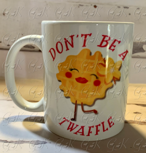 Get a grip on these humorous Don't Be A Twaffle coffee mugs! Great as gifts for yourself, teacher, family member, etc. with a sense of humor! Ceramic.
