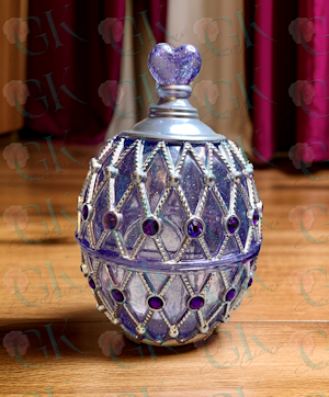 This Fabergé style egg trinket box is perfect for bedside to hold your precious valuables while you sleep. Or, put it on a display shelf, or table. Beautiful anywhere! More colors coming. Egg shown is translucent violet, with silver trim, a splash of iridescent glitter, and purple plastic gemstones.