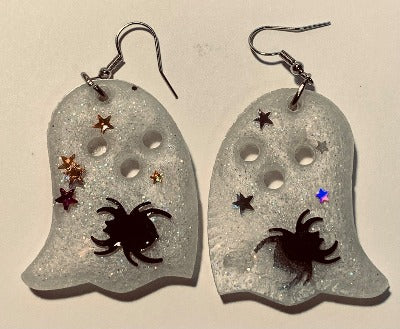 Ghost shaped Halloween earrings perfect for Halloween...or any other day! Made with resin and glitter with a bit of spooky embellishments. Ghosts are about 1 3/4” tall.