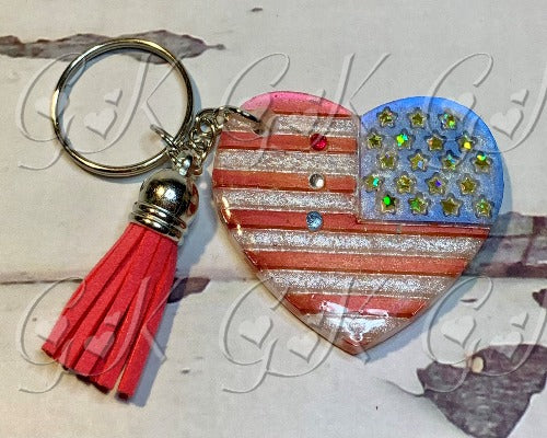 Don't be afraid to show your love for the USA with this Heart Flag keychain. Give as a gift for birthdays, Christmas, 4th of July, or any day. Or, keep for yourself. Has 3 little rhinestones decorating it in red, white and blue.