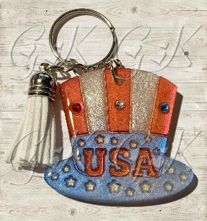 Don't be afraid to show your love for the USA with this Patriotic USA Hat keychain. Give as a gift for birthdays, Christmas, 4th of July, or any day. Or, keep for yourself. Has 3 little rhinestones decorating it in red, white and blue.