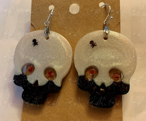 Spooky dangle Skull earrings to spice up your Halloween...or any other day you're looking to get a head! Made with resin and glitter and red gemstones in the eyes. These earrings come in pierced or clip-ons. No clip-ons or gold fish hooks shown at this time.