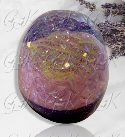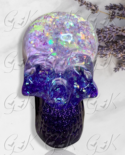 Skull shown is two tone. He is clear with fairy ice from the nose up, and purple glitter from the teeth down. The veins on this one glow a greenish yellow.