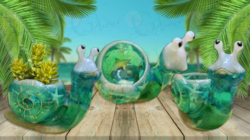 This adorable snail is created in an ocean theme with starfish, dolphin, shark, fish, octopus, shells and sand. The opening for the plant is small and is suitable for small succulents or cacti. For those who don’t want to use the snail as a planter, it would also make a nice dish for jewelry or small items. Only 1 available at this time.