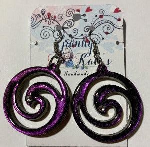 Spiral Earrings to dress up your day or night. The pair showing is hand painted with Gold/Red/Purple chameleon mica and filled with black. Then hand painted on the opposite side to shine as nicely as on the front. Then I adorned each earring with a single crystal gem to add a touch of posh. Comes in pierced or clip on in gold or silver.