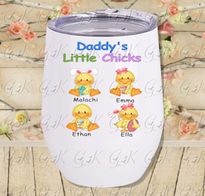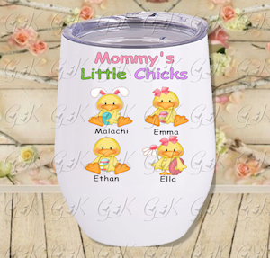 Little Chicks stainless steel stemless cup is a fun way to drink you favorite beverage without major spills. Great for use outdoors, driving, or camping. The 12oz cup includes a clear plastic lid. Double-wall stainless steel vacuum insulated.