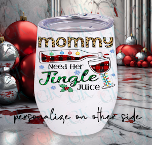 Mommy Needs Her Jingle Juice stemless wine cup. Perfect for those moments when you want to unwind and relax after a long day. Great for use outdoors and camping. The 12oz cup includes a clear plastic lid. Double-wall stainless steel vacuum insulated. Graphic says