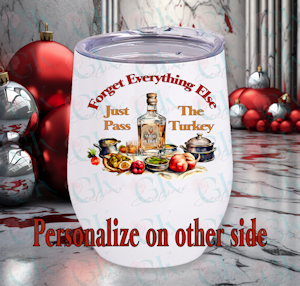 Unwind in style with our Stemless Cup, because it’s always Time to Wine Down. Perfect for those moments when you want to unwind and relax after a long day. Great for use outdoors and camping. The 12oz cup includes a clear plastic lid. Double-wall stainless steel vacuum insulated. Graphic says Forget everything else, just pass the Turkey". The TURKEY is the bottle of Wild Turkey sitting on the table instead or a roasted turkey. ".