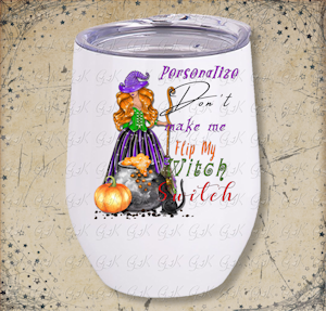 Unwind in style with our Stemless Cup, because it’s always Time to Wine Down. Perfect for those moments when you want to unwind and relax after a long day. Great for use outdoors and camping. The 12oz cup includes a clear plastic lid. Double-wall stainless steel vacuum insulated. Graphic says "Don't make me flip my witch switch".