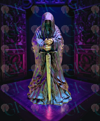 Step into the realm of mystery and intrigue with this stunning hooded reaper figurine, a captivating piece that embodies an eerie presence. Carefully sculpted with intricate detailing, this figure stands cloaked in flowing robes, its face concealed beneath a shadowed hood. Clutching a solemn sword, the reaper exudes a quiet yet powerful aura, making it an eye-catching statement piece for gothic or fantasy enthusiasts.