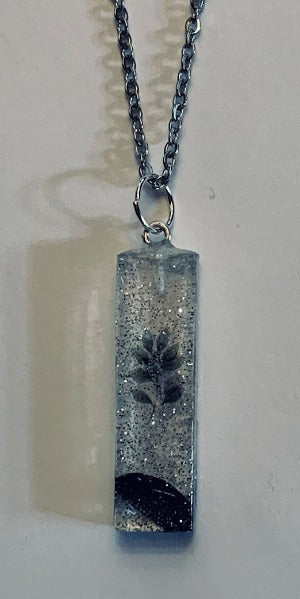 This resin pendant dazzles like crystal with enough silver glitter that is sure to grab attention. Settled at the bottom of the pendant is a Hematite chip and a small floral adorns front and back. Item can be made with gold glitter and findings.