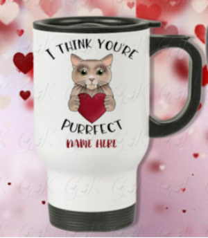 Show your Purrfect love with these adorable travel coffee mugs! Great for Valentine's Day, Anniversary, Birthday, etc.! These insulated mugs can be used in the car, at work, wherever!