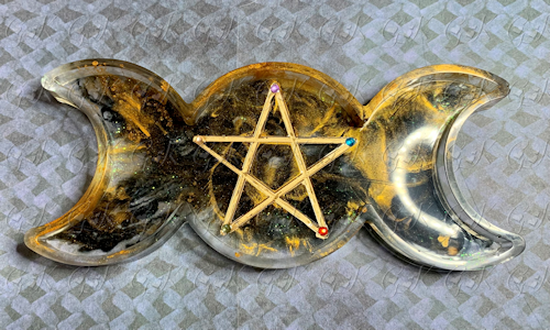 This triple moon tray is perfect for anything you want to put in it! It's great for jewelry, candles (in appropriate receptacle, of course), offerings, crystals, etc. This tray is 6" long, 3"wide, and is 1/2" tall.