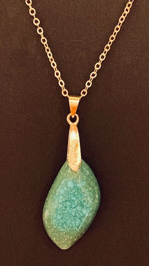 This beautiful resin pendant is filled with authentic powdered Turquoise and a smattering of gold glitter to make it sparkle. Small chunks of Turquoise that didn't get powdered can be seen where it has settled during the cure. The bail is adorned with a little leaf charm.